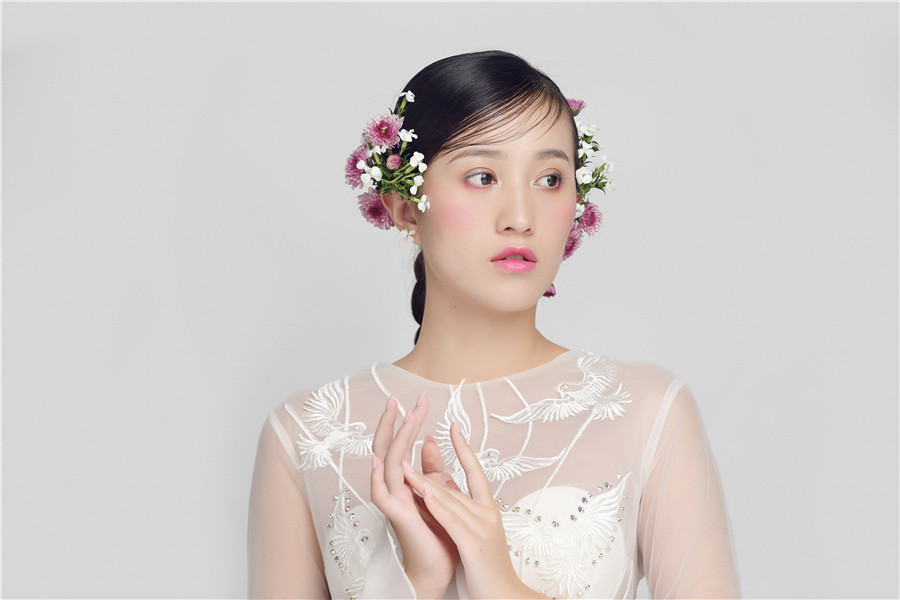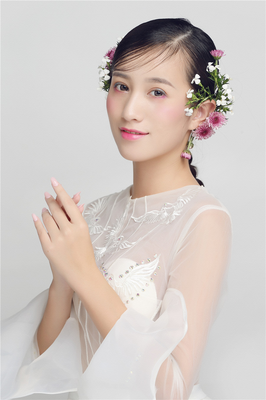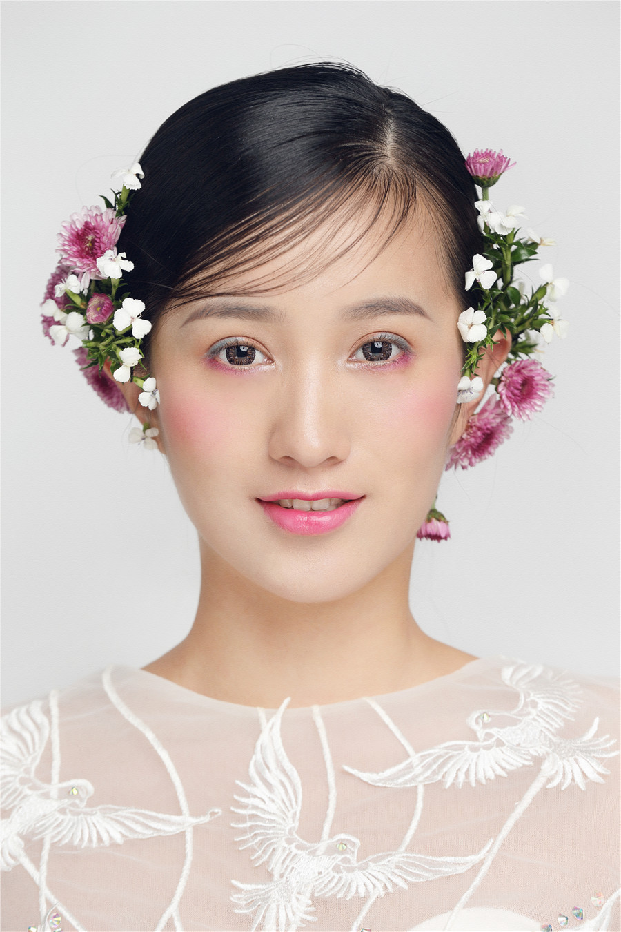 麗竹學校彩妝作品---花樣鮮花新娘:鮮花打造的新娘頭飾,展現(xiàn)美顏動人的一面。嬌艷的鮮花點綴于發(fā)絲之上,襯托新娘更加美麗嬌嫩。