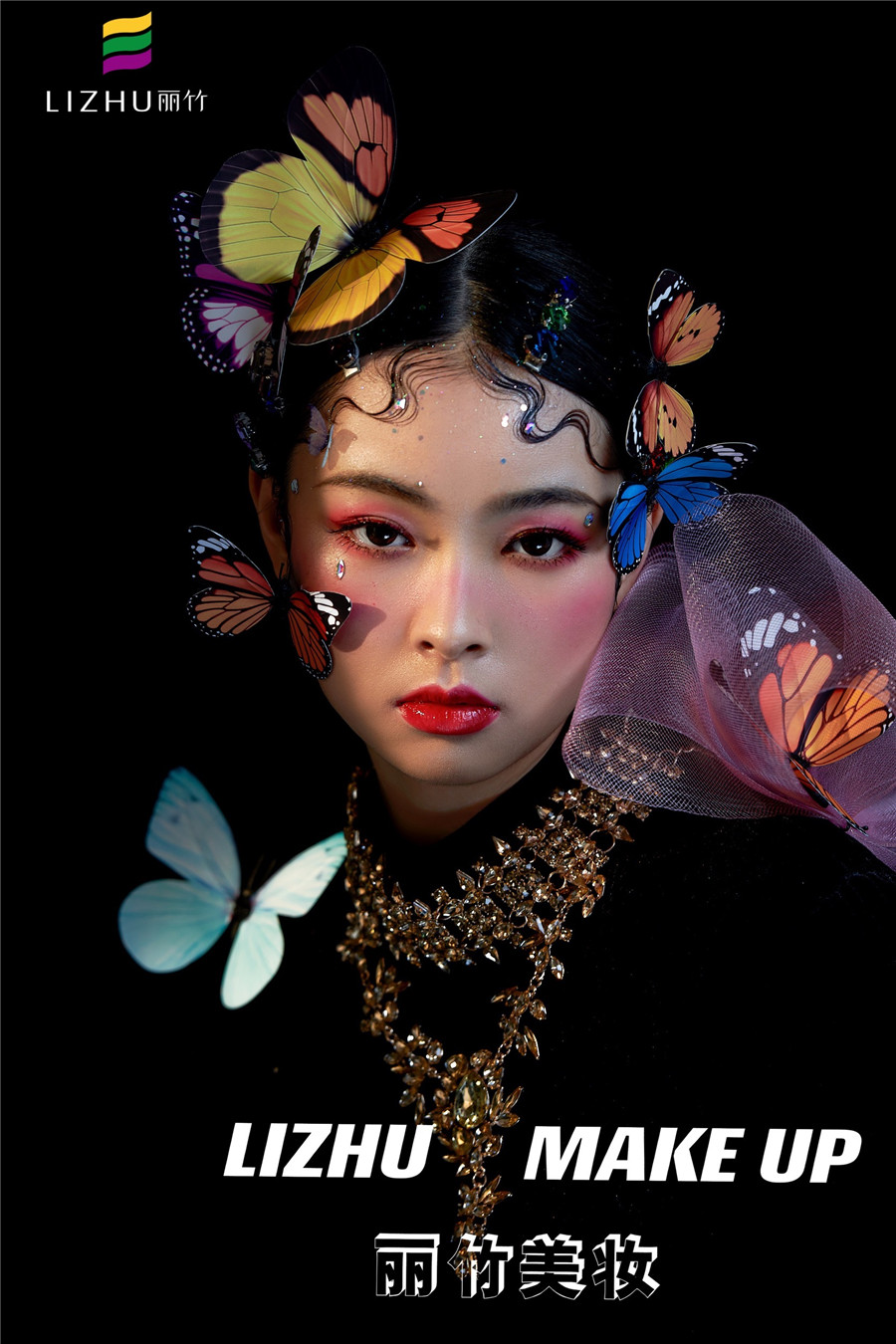 麗竹化妝學校作品---唯美蝴蝶妝容:肩頭兩鬢和眼前額頭,被五彩斑斕的蝴蝶點綴,強烈的黑色背景搭配亮眼色差,產(chǎn)生了很強的視覺效果,讓人過目不忘之余,更寓意破繭成蝶涅槃重生的狀態(tài)。
