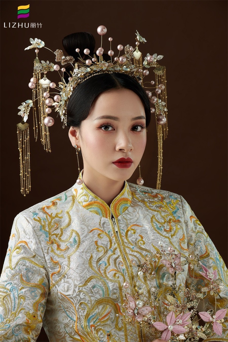 麗竹學(xué)校作品:中式秀禾新娘妝容造型:初見(jiàn)是始料未及的心動(dòng),沁人心扉的一抹金色,雍容華貴直擊眼球,恬雅流蘇微晃動(dòng)人,頗有小家碧玉的感覺(jué)。