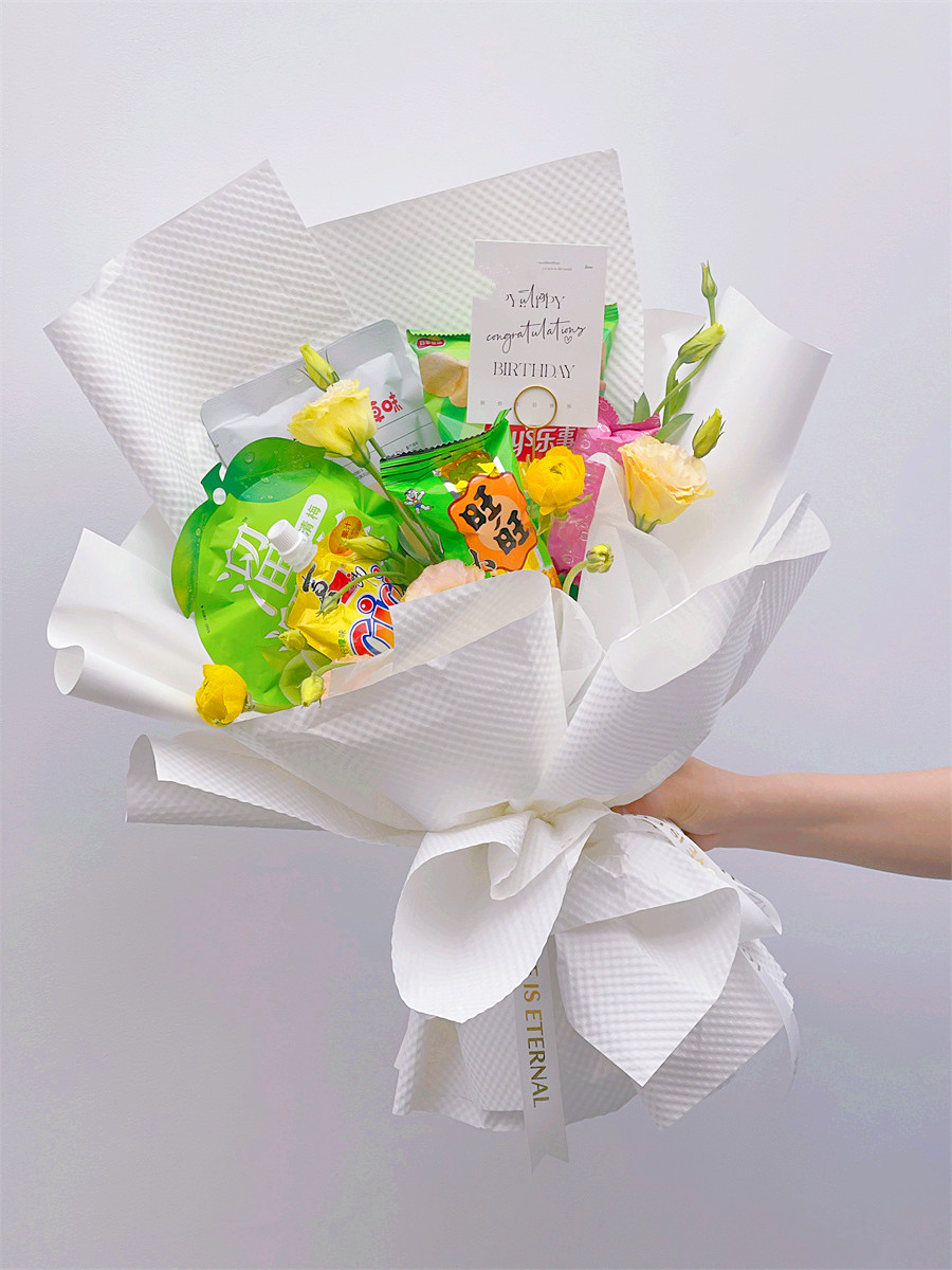而比較常見的可以用來(lái)做花束的零食,比較熱門的則是巧克力。對(duì)于熱戀中的情人來(lái)說(shuō),送上巧克力花束不要太浪漫哦!糖果類做成的花束也深受歡迎,其中棒棒糖花束對(duì)學(xué)生黨和小朋友格外有誘惑力。如果想要看起來(lái)比較豪放,完全可以選擇膨化類商品,如薯片,本身體積大,做出來(lái)的花束也是效果驚人。此外,除了吃的,喝的也是非常適合,比如盒裝牛奶,飲料等都可以通過你專業(yè)的花藝技術(shù)打造出充滿創(chuàng)意的零食花束。