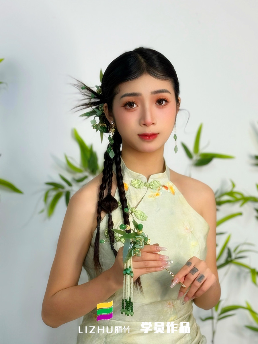 南寧化妝影樓造型、南寧化妝影樓培訓(xùn)(麗竹彩妝寫真培訓(xùn))---新中式造型:新中式長裙復(fù)古迷人,古風(fēng)盤發(fā)戴翠綠珠釵,綠色搭配竹葉的設(shè)計(jì),給人一種淡雅的感覺。如果你想學(xué)個(gè)人寫真藝術(shù)照造型,或是想在南寧培訓(xùn)寫真化妝,學(xué)更加全面的化妝技術(shù),建議你可以趁著麗竹學(xué)校正在進(jìn)行春季招生優(yōu)惠活動,趕緊聯(lián)系我們報(bào)名吧!