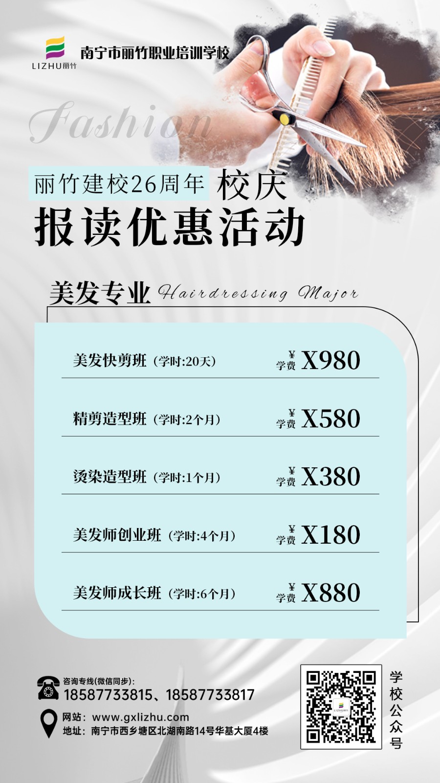 南寧女發(fā)造型、南寧理發(fā)剪發(fā):南寧剪發(fā)造型學(xué)校(麗竹剪發(fā)造型學(xué)校)接下來就為大家分享兩種常見的南寧剪發(fā)培訓(xùn)的內(nèi)容---女士發(fā)尾修剪方法。麗竹學(xué)?,F(xiàn)在正在進(jìn)行學(xué)費(fèi)報(bào)名優(yōu)惠活動(dòng),兩種不同內(nèi)容的活動(dòng),相信總有一個(gè)適合你。所以,想學(xué)美發(fā),就趕緊報(bào)名吧!