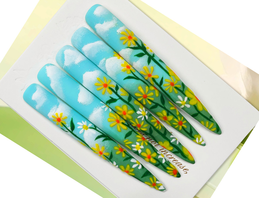 美甲技法:作品采用手繪+漸變的方式進(jìn)行。色彩清新舒適,用白色和藍(lán)色畫出藍(lán)天白云,在用黃色繪制出雛菊,使用漸變筆打造綠草叢生,并以此與藍(lán)天白云相互鏈接,打造自然感,仿佛讓人有種走入歌曲《晴天》里唱的“故事的小黃花”的浪漫氛圍中。
