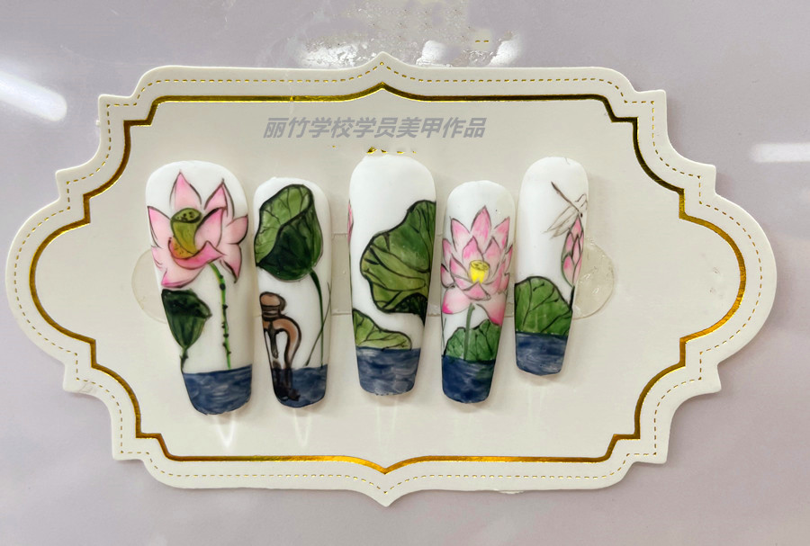 在廣西美甲真人實(shí)操的課堂上,廣西美甲造型專業(yè)學(xué)校的同學(xué)們,正在進(jìn)行以“荷花”為主題的彩繪美甲技能考核。經(jīng)過兩節(jié)課的時(shí)間繪制,同學(xué)們都按照老師平時(shí)教授的方法和技巧很好的完成考核規(guī)定繪制的手繪荷花美甲作品。