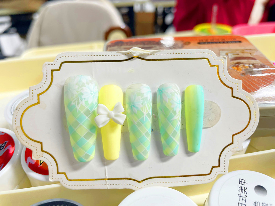 廣西美甲學習中心、廣西美甲進修提升作品解析:作品以白色、薄荷綠以及檸檬黃三種顏色為主。先用乳白色甲油膠作為底色,然后再用彩繪筆畫出格紋線條,并以不規(guī)則的方式用薄荷綠以及檸檬黃兩種顏色進行填充。之后在畫出白色的小雛菊作為主花,在檸檬黃甲片上粘貼蝴蝶結(jié)視頻,使得整副作品春意盎然,氛圍感十足!