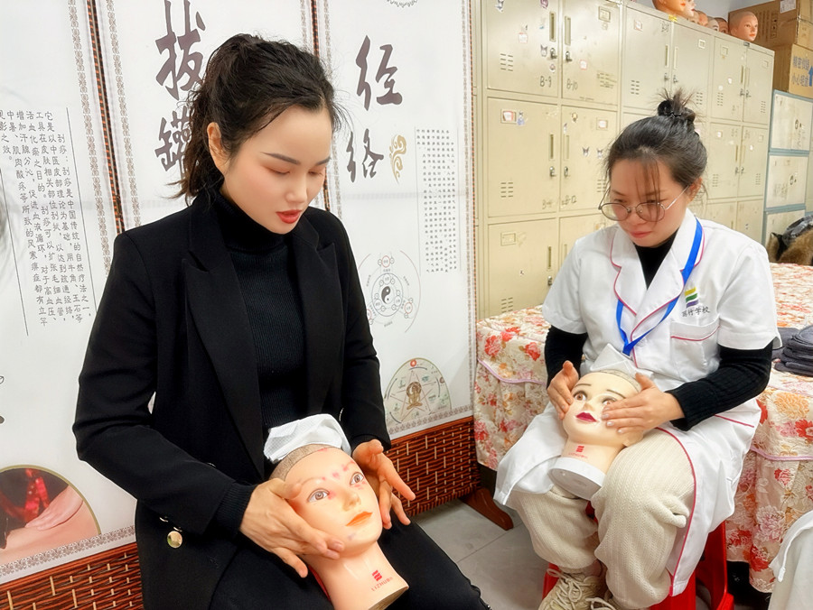 南寧皮膚管理護(hù)膚班同學(xué)跟著老師在假頭模上進(jìn)行手法練習(xí)