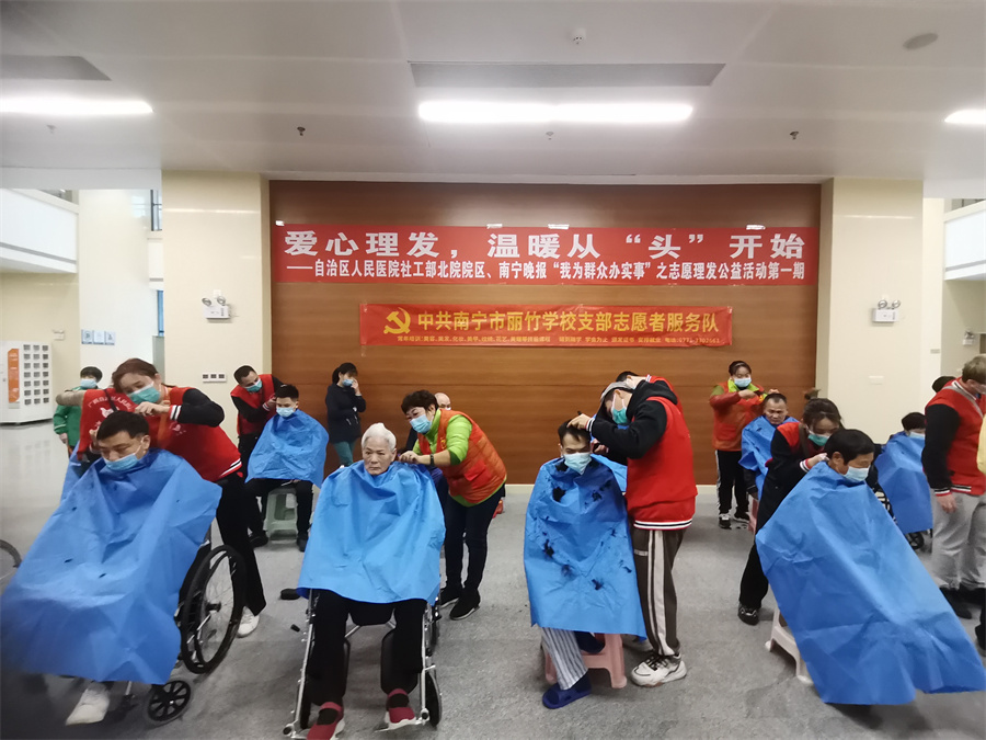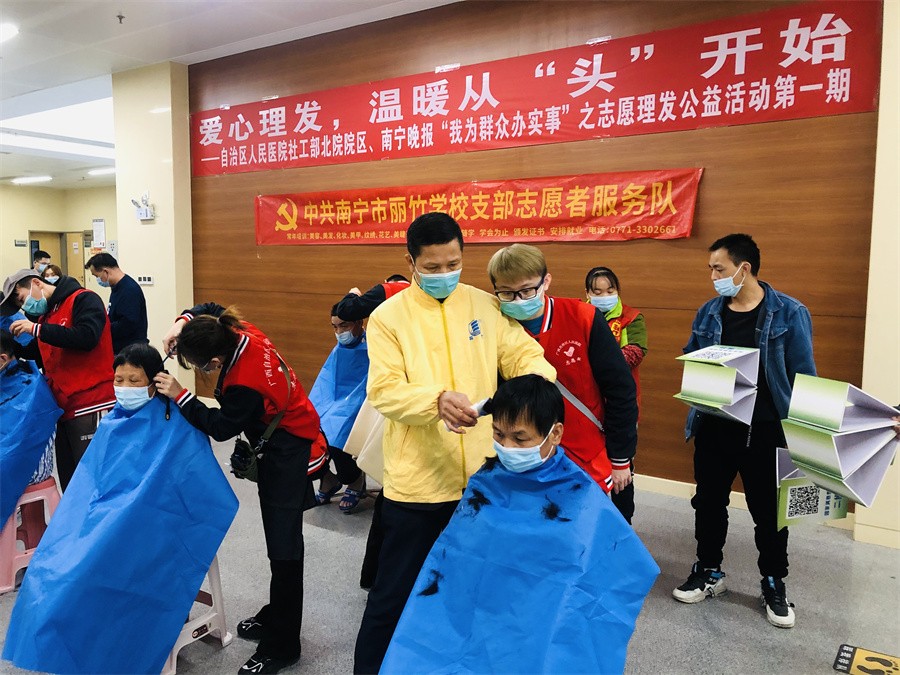 愛心理發(fā)進醫(yī)院、南寧美發(fā)學(xué)校志愿理發(fā)活動:12月3日,對于一些長期待在醫(yī)院的患者和家屬而言,不能隨意外出,久而久之理發(fā)成為了“頭”等大事。知道這樣的情況后,中共麗竹學(xué)校學(xué)校支部志愿者服務(wù)隊主動申請參加由南寧晚報“愛幫之家”聯(lián)合自治區(qū)人民醫(yī)院北院共同舉辦的---愛心理發(fā),溫暖從“頭”開始志愿公益理發(fā)活動,發(fā)揮專業(yè)特長,為有需要的人提供綿薄之力。
