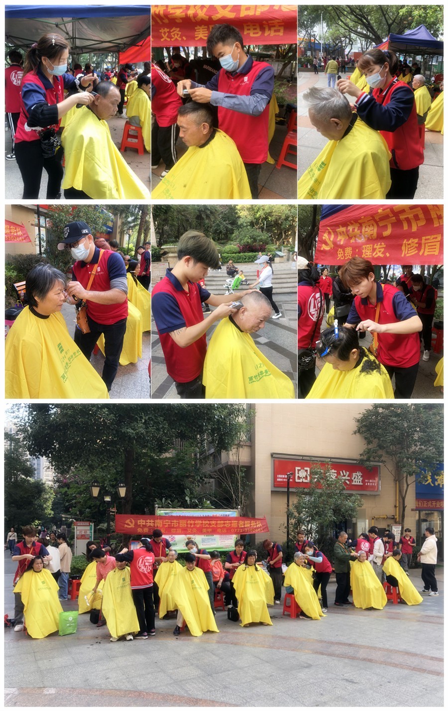 廣西理發(fā)師、廣西理發(fā)剪發(fā):廣西美發(fā)理發(fā)學(xué)校-麗竹學(xué)校美發(fā)志愿者服務(wù)隊(duì)走進(jìn)南寧市各大小區(qū),為居民們帶去冬日暖陽(yáng)里力所能及的免費(fèi)理發(fā)活動(dòng)。廣西理發(fā)剪發(fā),廣西專(zhuān)業(yè)剪發(fā),廣西培訓(xùn)理發(fā)志愿者服務(wù)隊(duì)為東溝嶺,人和萊茵社區(qū),翰林山水源外提供免罰理發(fā)。