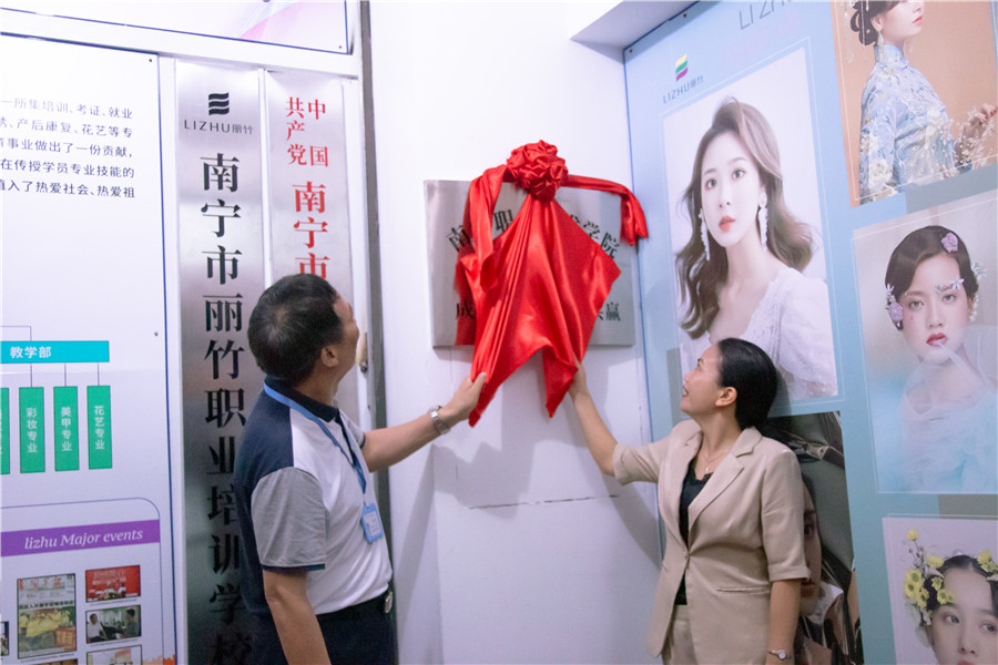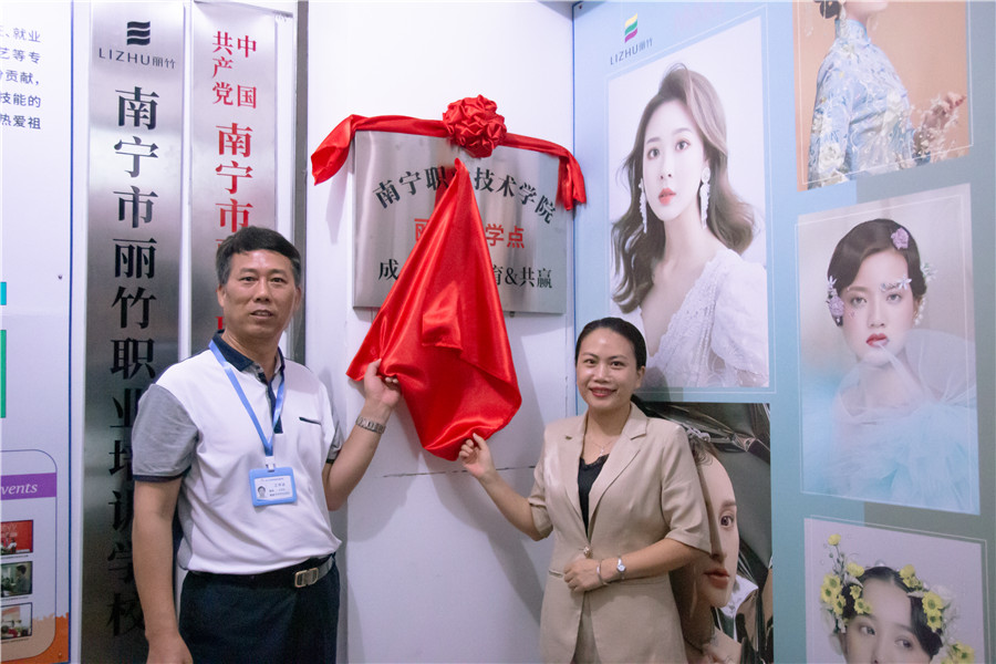 參加本次簽約揭牌儀式的嘉賓有:南寧麗竹職業(yè)培訓(xùn)學(xué)校黨支部書記,校長王良友、南寧職業(yè)技術(shù)學(xué)院---共贏教學(xué)點校長徐穆英、南寧麗竹職業(yè)培訓(xùn)學(xué)校副校長歐榮蘭、南寧麗竹職業(yè)培訓(xùn)學(xué)校招生就業(yè)部主任潘偉平、南寧麗竹職業(yè)培訓(xùn)學(xué)校教學(xué)部主任劉治才、南寧職業(yè)技術(shù)學(xué)院---市場招生辦教務(wù)監(jiān)督主任李容、南寧麗竹職業(yè)培訓(xùn)學(xué)?;瘖y總監(jiān)玉可寧、南寧麗竹職業(yè)培訓(xùn)學(xué)校美發(fā)組組長王姚芳、南寧麗竹職業(yè)培訓(xùn)學(xué)校美容組組長韋紅蘭以及麗竹學(xué)校美容,美發(fā),美甲,化妝組老師。