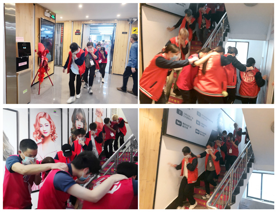 為了讓大家實地感受發(fā)生火災時逃生的緊迫感,師生在老師和李教員的引導下,進行了消防疏散逃生演練。低頭彎腰,相互將右手搭在前一個人的肩膀上,左手用濕毛巾捂住口鼻,緊貼著樓梯,有序地從樓上快速下樓疏散到安全區(qū)域。