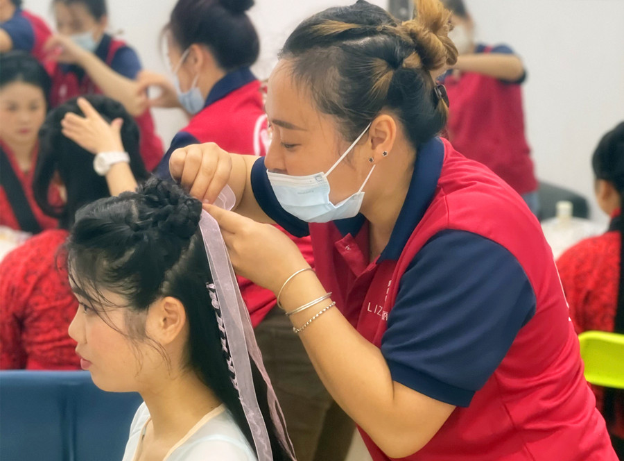 除了妝容的難度,在學(xué)習(xí)發(fā)型課程時(shí),我也覺(jué)得困難重重。比如,在做秀禾發(fā)型卷筒的操作時(shí),卷著卷著就突然不知道該如何收尾?又或者是做完后一看,才發(fā)現(xiàn)做出的形狀和老師的不一樣,不僅沒(méi)有美觀度,而且還松塌。然后在做赫本包時(shí),倒梳頭發(fā)沒(méi)到位,每次倒梳之后捋順赫本包又變小了。披發(fā)兩邊方向燙的不一致……